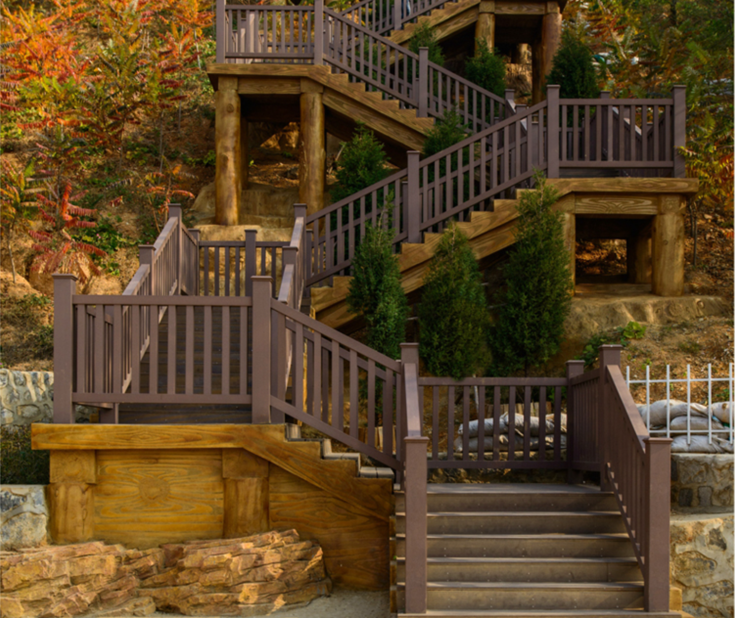 Combining durability with refined wood aesthetics, the material provides long-term outdoor stability while maintaining a natural appearance.